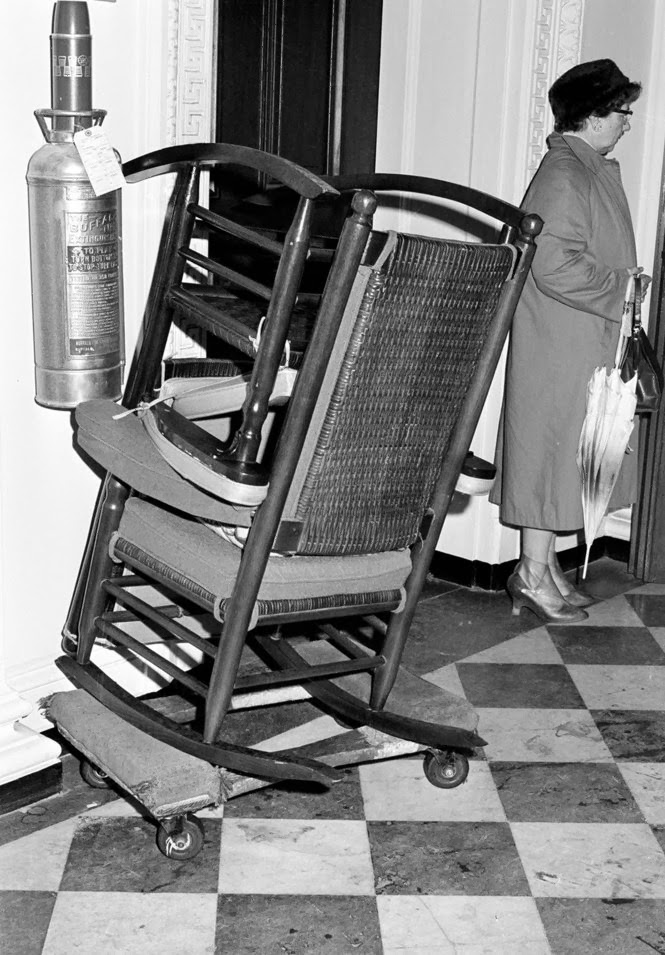 Photo by The Associated Press. Original caption: Personal belongings such as these two rocking chairs of the slain President John F. Kennedy are removed from the offices of the White House in Washington, D.C., Nov 23, 1963.